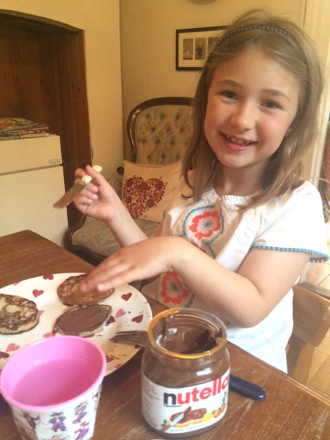 7. Put the cooked pancakes onto kitchen paper to absorb excess oil then serve with your choice of topping. Diggy likes maple syrup, Delilah prefers Nutella: