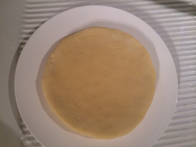 5) After 20 minutes roll out the dough on a lightly gluten free floured surface. Be careful, as it will crack so you need to be very gentle with it and shape and form it with care. You want to end up with a nice thick round cake shape, 2 cm high by 18 cm in diameter: