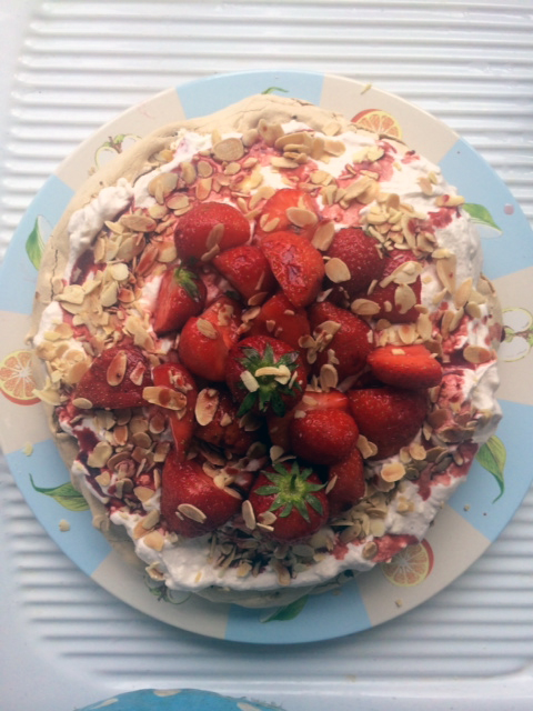 4. Put the pavlova onto a large, flat plate. Spoon over the cream, scatter on the remaining strawberries (I left some whole, halved some with their tops still on and topped and halved the rest) and the toasted flaked almonds and drizzle with the sauce. Serve to some very lucky people indeed. Yummmmm!