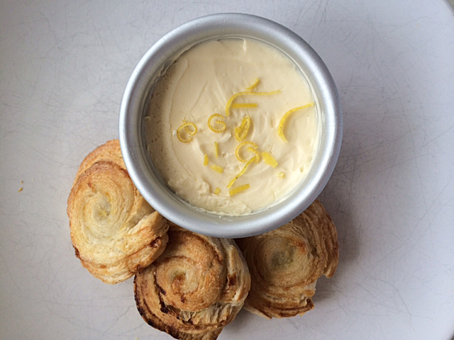On tonight’s Bake Off the technical challenge was a biscuit called an Arlette which involves making a sort of puff pastry from scratch. Whilst on holiday in Devon two weeks ago I saw a Rose Prince dessert in a newspaper magazine which I thought sounded easy to make and tasty. I thereby unwittingly made these very same biscuits. (Well, sort of, anyway). I had no idea they were called Arlettes; I thought they were more of a Palmier (shows how much I know). Of course I didn’t make my own puff pastry and I suspect Paul and Mary would have issues with my thickness (and not having any cinnamon in them) but nevertheless they were delicious and went beautifully with the gorgeous lemon mousse, so, with a small amount of alteration, here they are. (Serves 4 – 6 depending on the size of your ramekins).