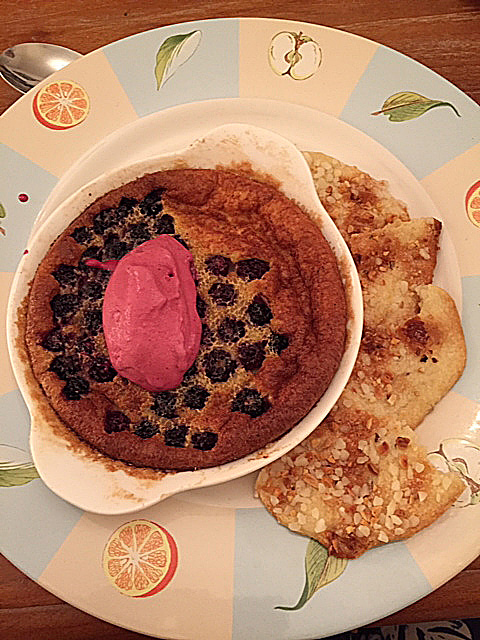 I also made some blackberry clafloutis for dessert (actually as I didn’t use cherries it can’t be called a clafloutis, but a flaugnarde) and had thought I’d blog about that. But that wasn’t as amazing as I’d hoped either and I carelessly blobbed some blackberry ice cream on top of it before I could take its photo so it looked a bit of a mess:
