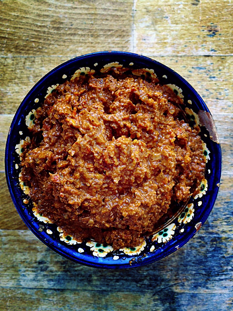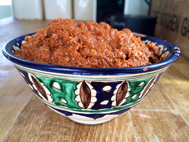 Last week a lovely friend came to stay for the night. For supper I prepared harissa grilled salmon, cumin roasted root vegetables (aubergines, purple carrots, sweet potatoes) and some freekeh (a nutty flavoured Middle Eastern grain). I also made, for the first time, some muhammara – a Syrian dip made from red peppers and walnuts. The main dish didn’t turn out quite as I’d envisaged. The purple veggies and dark green freekeh looked a bit murky and could have really done with some onions mixed in; Mr Arabella Cooks was not at all keen, although both he and the friend said the salmon was lovely. I had the leftover veggies and salmon the next day as a salad with some spinach and toasted seeds and it was absolutely heavenly. Much nicer than it had been as a hot dish the night before (sorry to my lovely friend). I’ll definitely make it again, but as a salad.