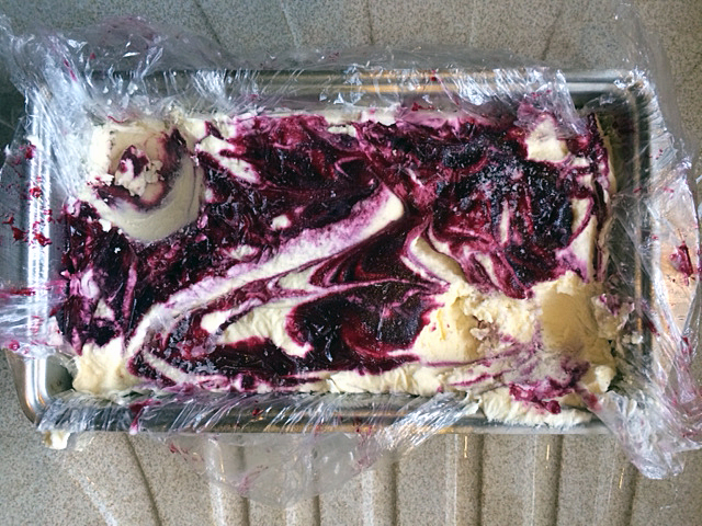 3. For both methods once cream is churned/thick:  In either your loaf tin or a shallow plastic tub, add a layer of the cream, add a layer of the coulis, add another layer of cream and another layer of coulis, then a final layer of cream and the rest of the coulis on top. Use a knife or metal pronged stick to ripple the coulis around and through the cream, leaving a lovely swirly pattern on the top (this photo is of some blackcurrant ripple I made recently but you get the idea).