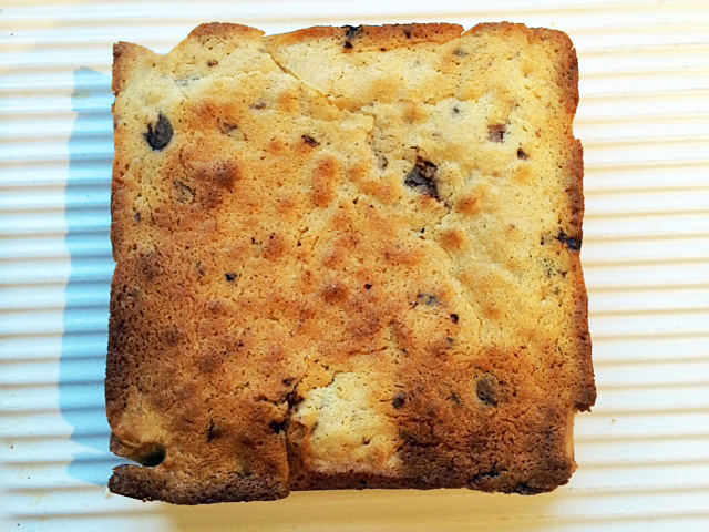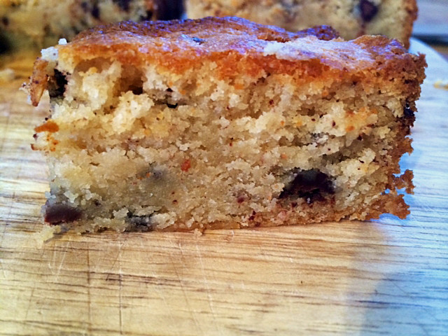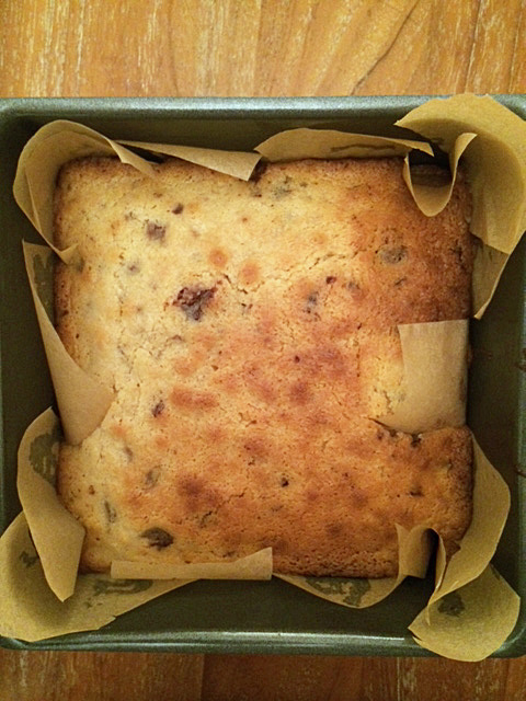 It’s late, I’m tired, I’ve been to Manchester and back to today and have only just finished working, but I promised someone I’d blog this very tasty blondie by tomorrow and at ten o’clock tomorrow morning I’m going to deepest, darkest Devon with no wifi or phone signal (the reality of this is just sinking in..) so it’s now or never. As you know the daughter has coeliac disease; she’s a very fussy eater; she likes chocolate (no fussiness with that foodstuff – what a shocker) and she’s also allergic to eggs. I’ve developed a blondie recipe that she can eat and actually doesn’t taste like it’s gluten AND egg free (it’s not crumbly and it has a decent rise) so here it is. (I made it with my new miracle egg replacer discovery – whipped chick pea brine, but I’ll give you directions for using the real thing too). It’s yum. When I left this morning the whole cake was intact as per the photo above; on my return this evening there were a few crumbs left. Mr Arabella Cooks and three lively children had demolished almost all of it (and I’ve just polished the rest off).